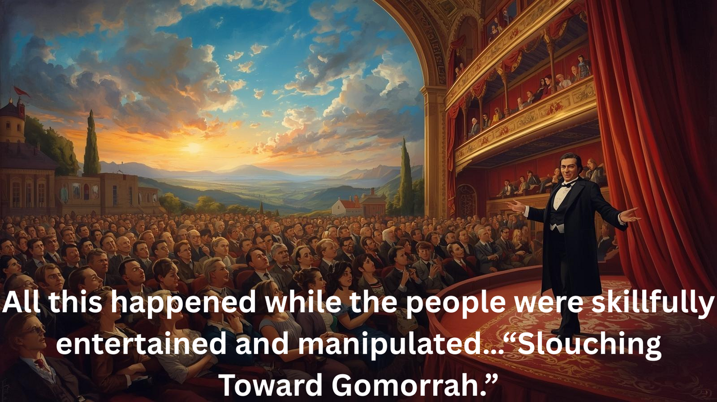 All this happened while the people were skillfully entertained and manipulated…“Slouching Toward Gomorrah.”