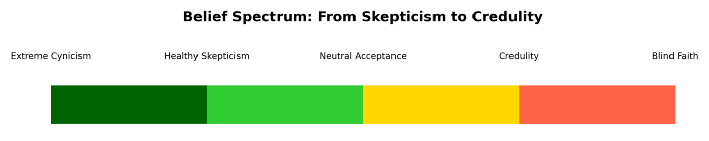 - Blind Faith (far right): Complete acceptance without evidence—maximum vulnerability.