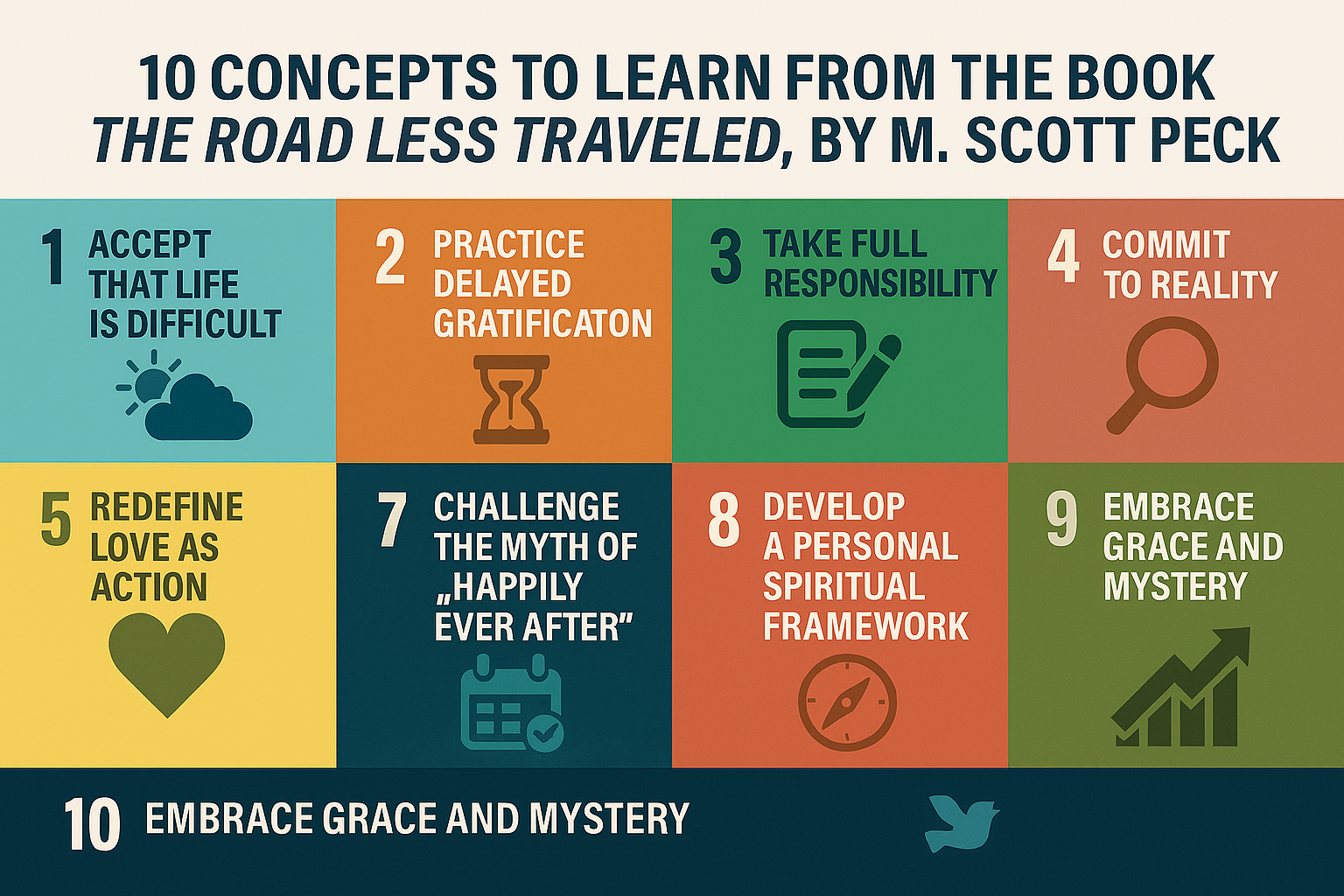The Road Less Traveled endures because it tells the truth about growth: it is demanding, daily work—yet deeply rewarding. The ten lessons above distill Peck’s core: start by accepting reality, then choose the hard good (discipline over impulse), own your part without shame or blame, tell the truth even when it hurts, and balance competing goods with flexibility. Treat love as a daily verb, retire the myth of effort-free happiness, construct a thoughtful worldview, remain open to grace, and keep going—for life.