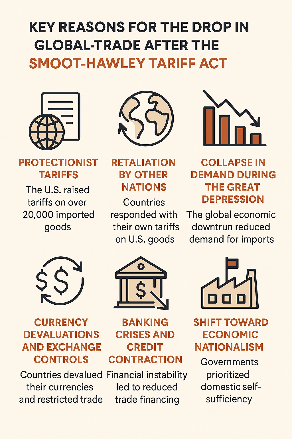 - This led to a tit-for-tat trade war, which in turn led to shrinking global markets and reduced demand for exports.
