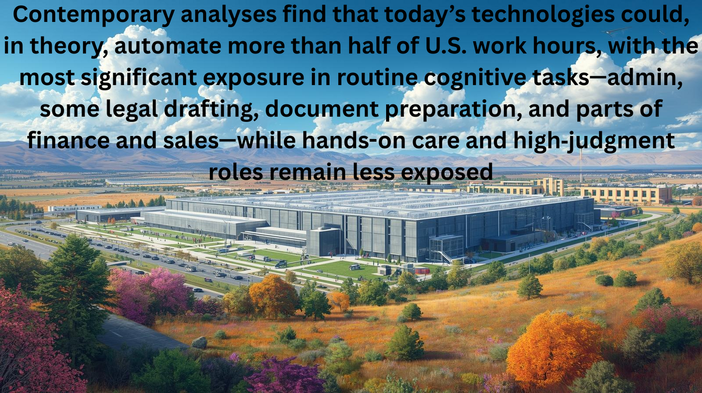 Over the past decades, automation and digitization have steadily reallocated tasks from humans to machines, both in manufacturing (robots, CNC, MES) and in services (software, RPA, analytics). Contemporary analyses find that today’s technologies could, in theory, automate more than half of U.S. work hours, with the most significant exposure in routine cognitive tasks—admin, some legal drafting, document preparation, and parts of finance and sales—while hands-on care and high‑judgment roles remain less exposed. That is a measure of the potential for task automation, not a deterministic job‑loss forecast, but it signals the breadth of disruption already underway.