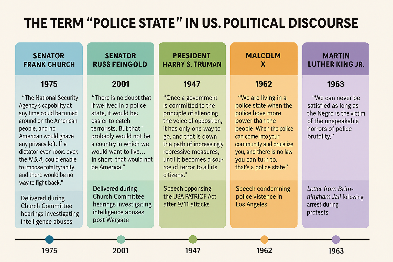 - Surveillance State Concerns: From Church Committee to Snowden-era debates, “police state” critiques often center on privacy and government overreach.