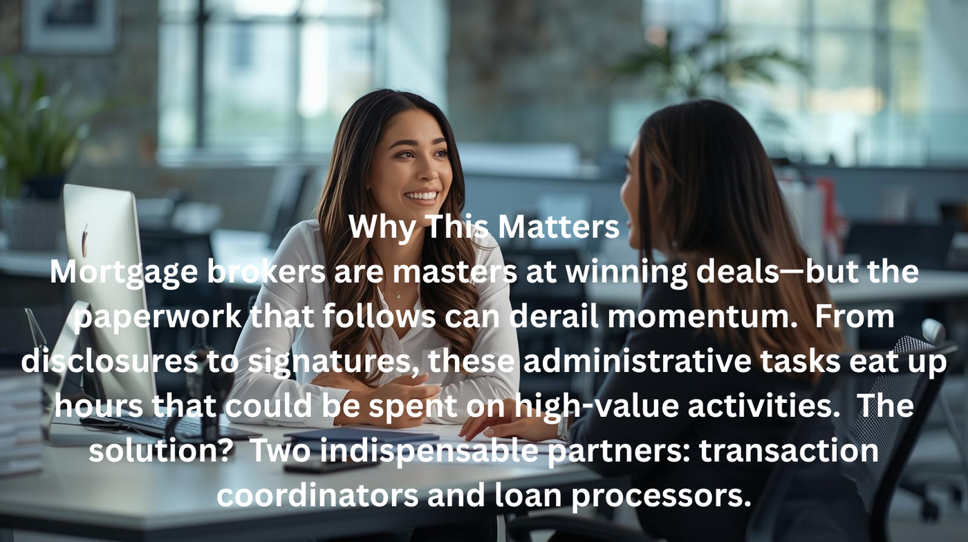 Mortgage brokers are masters at winning deals—but the paperwork that follows can derail momentum. From disclosures to signatures, these administrative tasks eat up hours that could be spent on high-value activities. The solution? Two indispensable partners: transaction coordinators and loan processors.