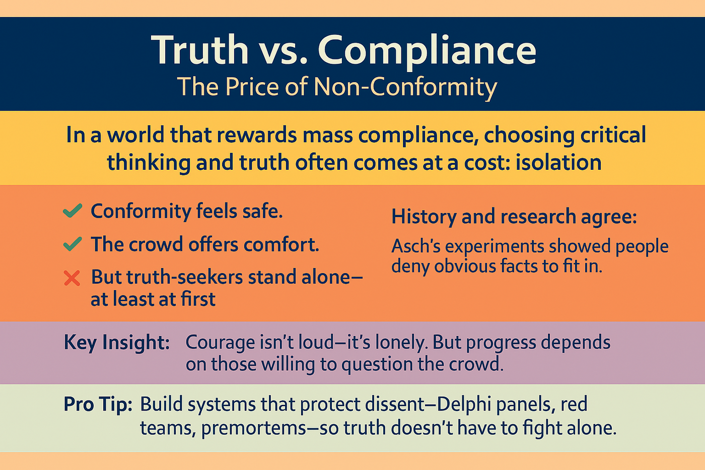 💡 Pro Tip: In a world that often rewards mass compliance, it’s crucial to build systems that protect dissent—Delphi panels, red teams, premortems—so truth doesn’t have to fight alone.