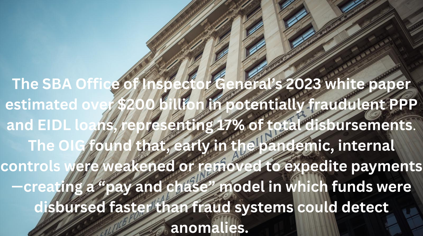 The SBA Office of Inspector General’s 2023 white paper estimated over $200 billion in potentially fraudulent PPP and EIDL loans, representing 17% of total disbursements. The OIG found that, early in the pandemic, internal controls were weakened or removed to expedite payments—creating a “pay and chase” model in which funds were disbursed faster than fraud systems could detect anomalies.