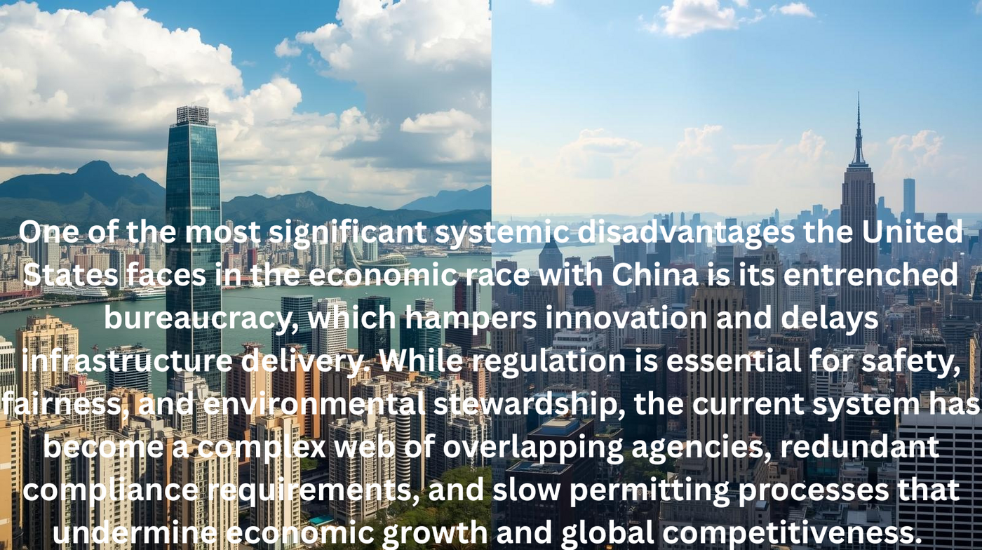 One of the most significant systemic disadvantages the United States faces in the economic race with China is its entrenched bureaucracy, which hampers innovation and delays infrastructure delivery. While regulation is essential for safety, fairness, and environmental stewardship, the current system has become a complex web of overlapping agencies, redundant compliance requirements, and slow permitting processes that undermine economic growth and global competitiveness. Addressing these issues can restore confidence in U.S. economic leadership and inspire policymakers to pursue meaningful reforms.