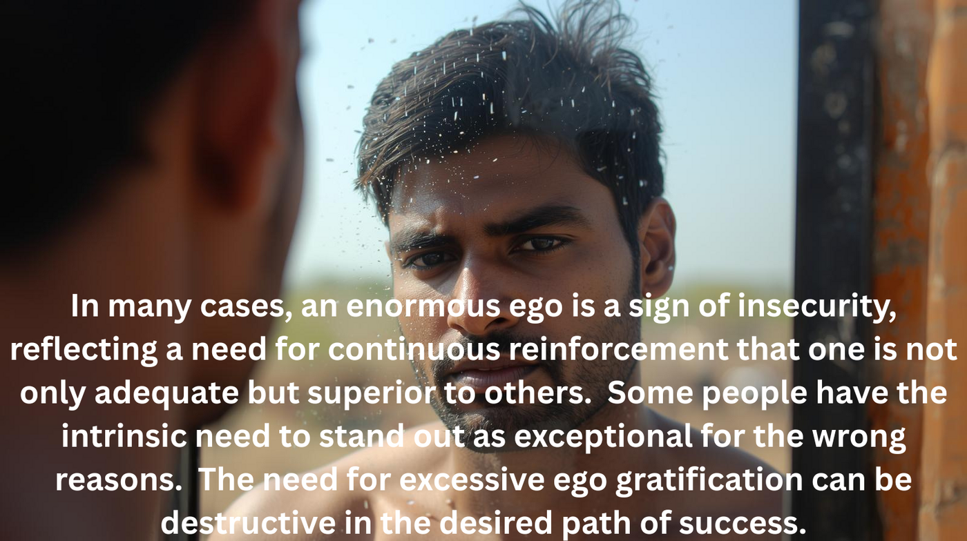 In many cases, an enormous ego is a sign of insecurity, reflecting a need for continuous reinforcement that one is not only adequate but superior to others. Some people have the intrinsic need to stand out as exceptional for the wrong reasons. The need for excessive ego gratification can be destructive in the desired path of success.