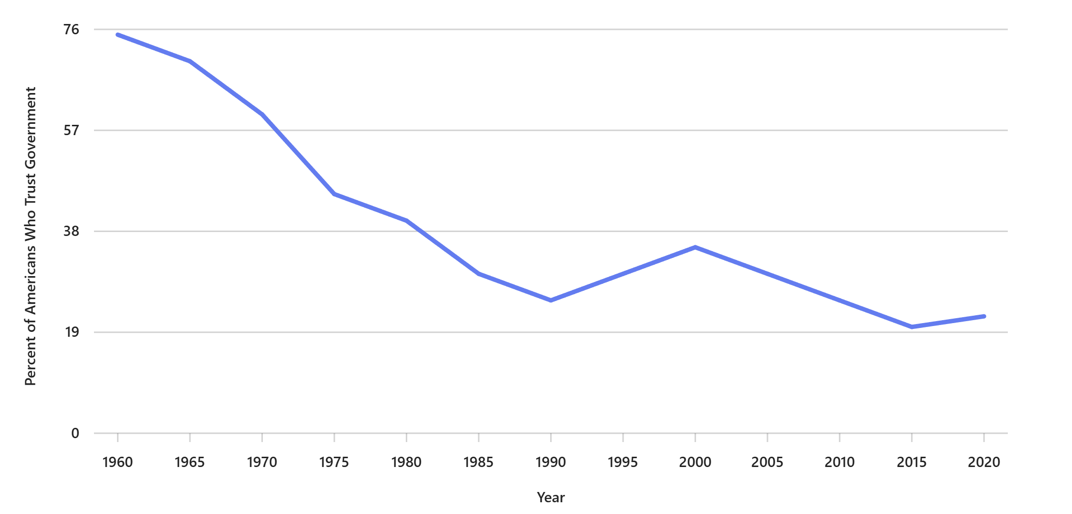 Long-run decline in the share of Americans who say they trust the federal government “just about always” or “most of the time.”